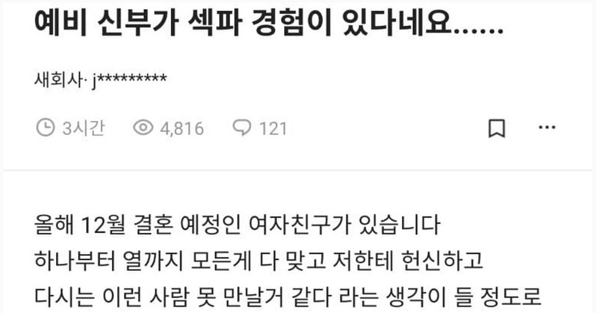 예비 신부가 섹파 경험이 있다는 걸 알게 된 썰