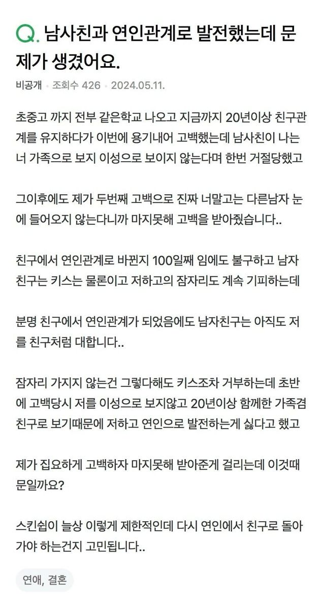 20년지기 남사친과 연인되었다가 스킨쉽 못해서 고민중인 여사친 ㅋㅋㅋ